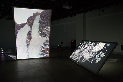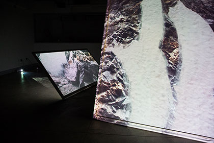 Liquid Crystal Multi-channel video installation, 2 projection screens, 1 phone, 1 tablet, tree stump, sound. 2017